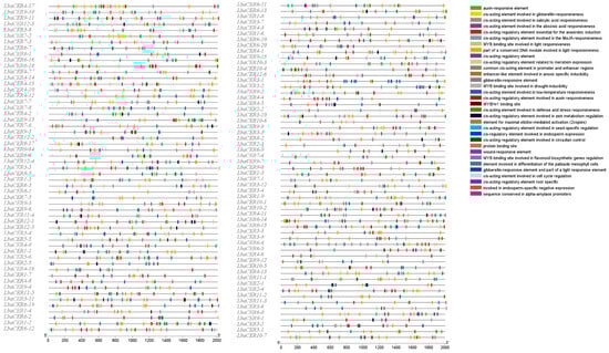 To analyze the cis-acting elements contained in the promoter region, the upstream 2000 bp sequences of 113 goji CER genes were extracted using TBtools (v2.056). The online software PlantCARE version 2.0 (http://bioinformatics.psb.ugent.be/webtools/plantcare/html/, accessed on 12 August 2025) was used to predict the cis function components. The TBtools (v2.056) software gene structure view (advanced) was used for visualization.