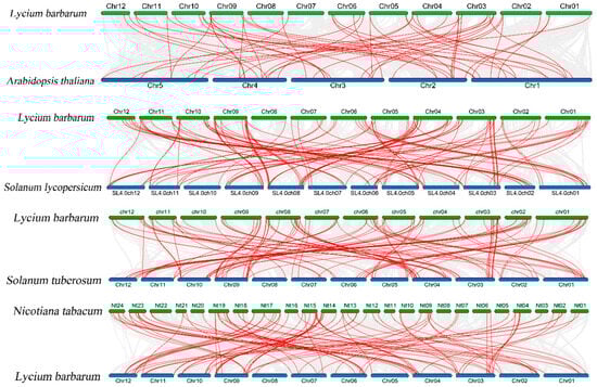 The chromosomal localization information of goji CER gene family members was extracted from the goji genome annotation file. Chromosomal distribution mapping of goji CER genes was subsequently performed using the MG2C online tool (http://mg2c.iask.in/mg2c_v2.1/, accessed on 11 August 2025) [48]. Synteny relationships, including both intraspecies and interspecies analyses, were investigated using TBtools software (version 2.056). The data for the tomato, potato, and tobacco genomes were downloaded from the Sol genomics network (https://solgenomics.net/, accessed on 8 August 2025).