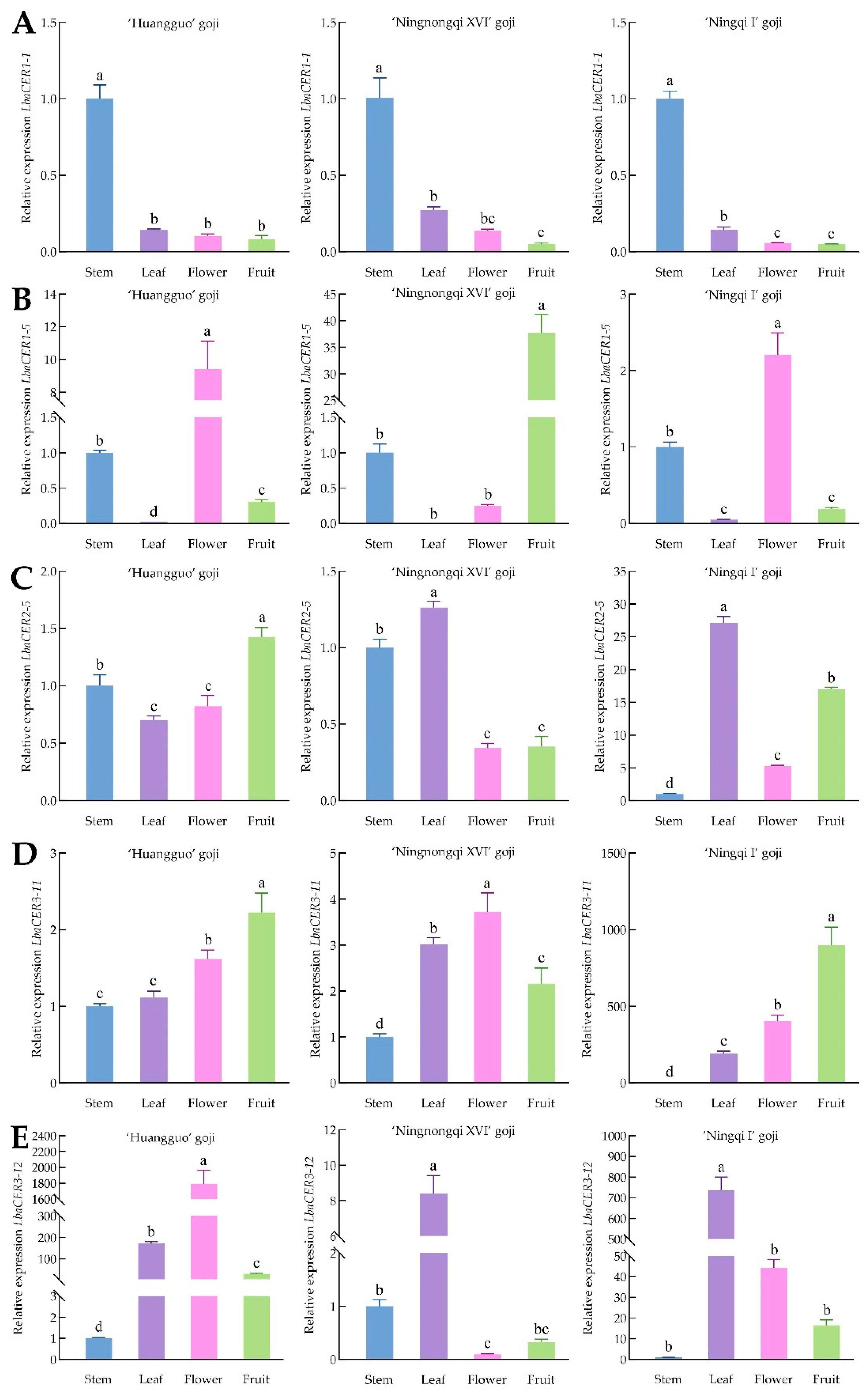 3.8. Expression Analysis of Five CER Genes in Different Goji Cultivars and Organs