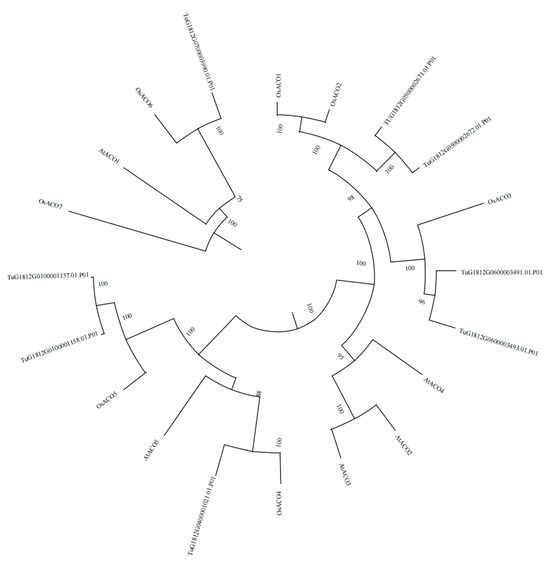 Relationship analysis of the eight TuACO genes in T. urartu, nine OsACO genes of rice, and five AtACO genes of Arabidopsis thaliana was performed. Their protein sequences were used to construct an evolutionary tree (Figure 1). The clustering results showed that TUG1812G0500002671.01 and TUG1812G0500002672.01 clustered with OsACO1 and OsACO2; TuG1812G0600003491.01 and TuG1812G0600003493.01 clustered with OsACO3; TuG1812G0400001021.01 clustered with OsACO4; TuG1812G0100001157.01 and TuG1812G0100001158.01 clustered with OsACO5; TuG1812G0700003990.01 clustered with OsACO6; AtACO2, AtACO3, and AtACO4 formed a distinct cluster; while OsACO7 constituted a separate cluster. Therefore, TUG1812G0500002671.01, TuG1812G0500002672.01, TuG1812G0600003491.01, TuG1812G0600003493.01, TuG1812G0700003990.01, TuG1812G0400001021.01, TuG1812G0100001158.01, and TuG1812G0100001157.01 were designated as TuACO1a, TuACO1b, TuACO3a, TuACO3b, TuACO6, TuACO4, TuACO5a, and TuACO5b, respectively. These results indicate that T. urartu exhibits a closer phylogenetic relationship with rice, while showing a more distant relationship with Arabidopsis thaliana. Additionally, an ortholog of OsACO7 appears to be absent in the T. urartu genome.