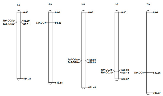 Based on the physical positions of TuACO genes, eight TuACO genes were mapped to five chromosomes (Figure 2). Specifically, TuACO5a and TuACO5b were located on chromosome 1A; TuACO4 was located on chromosome 4A; TuACO1a and TuACO1b were located on chromosome 5A; TuACO3a and TuACO3b were located on chromosome 6A; and TuACO6 was located on chromosome 7A. The results showed that the distribution of TuACO genes across the chromosomes appeared to be non-uniform. The Ka/Ks ratio (non-synonymous substitution rate/synonymous substitution rate) can reflect a gene’s evolutionary pattern and the selective pressure it has experienced during evolution. In this study, Ka/Ks ratios were used to assess the selection pressure acting on TuACO5a/TuACO5b, TuACO1a/TuACO1b, and TuACO3a/TuACO3b during their evolutionary history. The Ka/Ks values of TuACO5a/TuACO5b, TuACO1a/TuACO1b, and TuACO3a/TuACO3b were 0.10, 0.13, and 0.36, respectively. These results indicated that TuACO5, TuACO2, and TuACO1 underwent strong purifying selection throughout their evolutionary process.