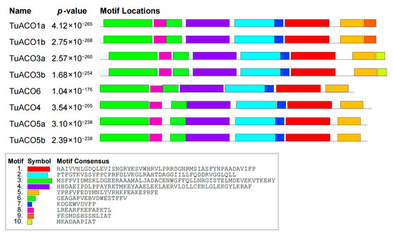 The TuACO gene structure analysis revealed that the number of introns and exons varied significantly. The number of introns ranged from 0 to 3, while the number of exons ranged from 1 to 4 (Figure 3). TuACO4 contained three introns and four exons; TuACO3b, and TuACO6 each contained two introns and three exons; TuACO1a and TuACO1b each contained two exons and one intron; and TuACO3a, TuACO5a and TuACO5b each contained one exon with no intron. These findings indicate substantial structural variation among TuACO genes. On the other hand, the protein conserved motif analysis revealed that the TuACO protein family contained a total of 10 different conserved motifs, with all eight genes containing motifs 1–8, whereas motif 9 was present in TuACO1a and TuACO1b, and motif 10 was only present in TuACO3a and TuACO3b (Figure 4). The functional annotation also showed that motifs 1, 5 and 7 belonged to the 2OG-Fe (II) oxidase superfamily and were typical domains of the ACO gene family. Motif and domain analyses reveal that TuACO gene sequences are relatively conserved.