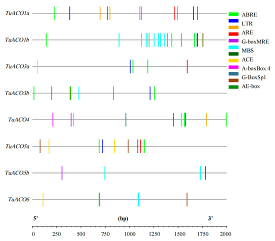 In rice, OsACO1, OsACO2, OsACO3, OsACO5, and OsACO7 are induced by light, ethylene, auxin, cytokinin, gibberellin, and abscisic acid to participate in diverse biological developmental processes and abiotic stress responses [19,20,21]. Promoter cis-acting element analysis revealed that TuACO gene promoters contained multiple stress-associated core regulatory elements, including the hormone-responsive element, ABRE; low-temperature stress element, LTR; and light-responsive elements, G-box, ACE, MRE, Sp1, and Box 4 (Figure 5). MYB transcription factors, known for their broad involvement in plant development and stress regulation, were found to have abundant binding sites in TuACO promoters. Additionally, anaerobic response elements (ARE) were identified in this trial, and the presence of multiple elements in the promoter is consistent with the TuACO gene’s broad involvement in responses to both biotic and abiotic stresses. Among the eight TuACO genes, TuACO1b contains up to 16 cis-acting elements, with the highest abundance of ABA-responsive elements and MYB transcription factor binding sites. In contrast, TuACO6 and TuACO5b possess only four elements each. This differential distribution of core promoter elements among TuACO genes aligns with their involvement in diverse stress responses.