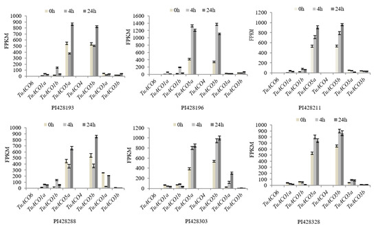In order to analyze the response of TuACO gene to biological stress, transcriptome expression data of the TuACO genes in six T. urartu wheat varieties infected by powdery mildew pathogen was obtained from the Wheatomcis website (http://wheatomics.sdau.edu.cn) [17]. The results showed that the expression patterns of the eight TuACO genes were generally similar across the six varieties. At 0 h post-inoculation (hpi), 4 hpi, and 24 hpi with powdery mildew, TuACO5a and TuACO5b consistently exhibited the highest expression levels, while TuACO6, TuACO3b, and TuACO4 showed the lowest expression levels, respectively. The expression levels of different genes varied among different varieties. For example, in variety PI428196, the expression levels of TuACO5a and TuACO5b were significantly upregulated by 4 hpi. In contrast, in varieties PI428193 and PI42888, their expression levels decreased by 4 hpi. In three varieties PI428193, PI428196, and PI428288, TuACO1b was significantly upregulated by 4 hpi, while in the other three varieties, the changes were relatively minor. Specifically, TuACO5a was downregulated in PI428288 4 hpi (Figure 7). The results indicate that TuACO5a and TuACO5b are involved in the powdery mildew stress response in T. urartu.