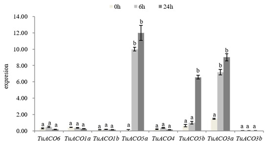 Expression of TuACO after infection by powdery mildew. Different letters represent statistical difference p < 0.05.
