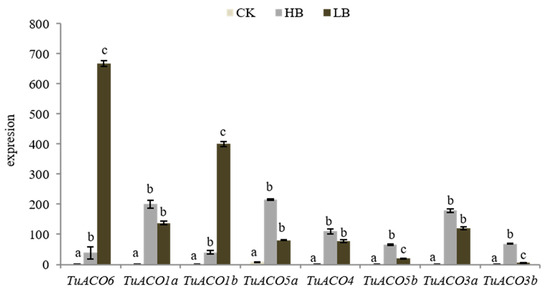 Expression of TuACO under high B and low B. Different letters represent statistical difference p < 0.05.