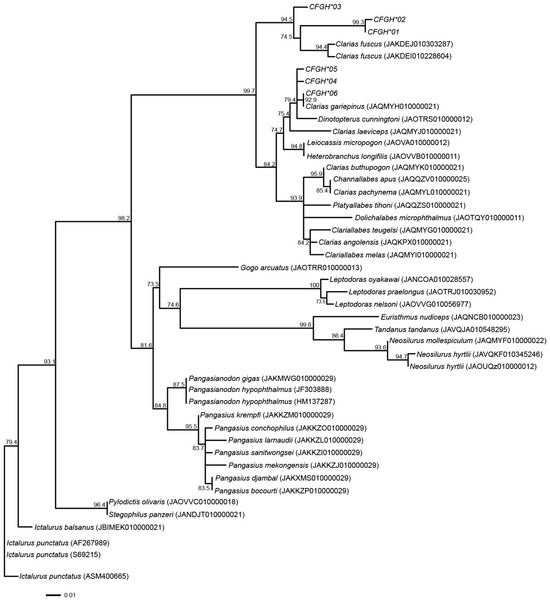 Reference sequences of the GH1 genes of different catfish species, Lanzhou catfish (Silurus lanzhouensis) (accession no. KM215221), blind catfish (Rhamdia quelen) (EF101341), yellowhead catfish (Tachysurus fulvidraco) (KU323395), channel catfish (Ictalurus punctatus) (AF267989 and S69215), iridescent shark catfish (Pangasianodon hypophthalmus) (JF303888 and HM137287), North African catfish (AF416488), Valencienne’s clariid (Clarias dussumieri) (HM485574), mudfish (Clarias anguillaris) (HM485573), and walking catfish (Clarias batrachus) (AF416486)], were retrieved from the NCBI using BLASTp (https://blast.ncbi.nlm.nih.gov/Blast.cgi). BLASTp analysis was performed in condition with thresholds of >60% sequence identity and >85% query coverage thresholds [63,64]. The amino acid residues of the GH1 gene alleles identified in this study and reference sequences of other catfish species were aligned using ClustalW in Geneious Prime version 2023.0.4 (https://www.geneious.com). The alignment was then trimmed to 35 residues, and a maximum likelihood phylogenetic tree was constructed with 10,000 ultrafast bootstraps, as previously described.
