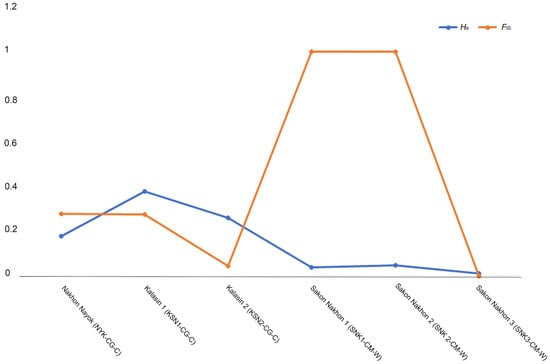 Mapping of expected heterozygosity (He) against inbreeding coefficients (FIS) based on GH1 gene for catfish populations.