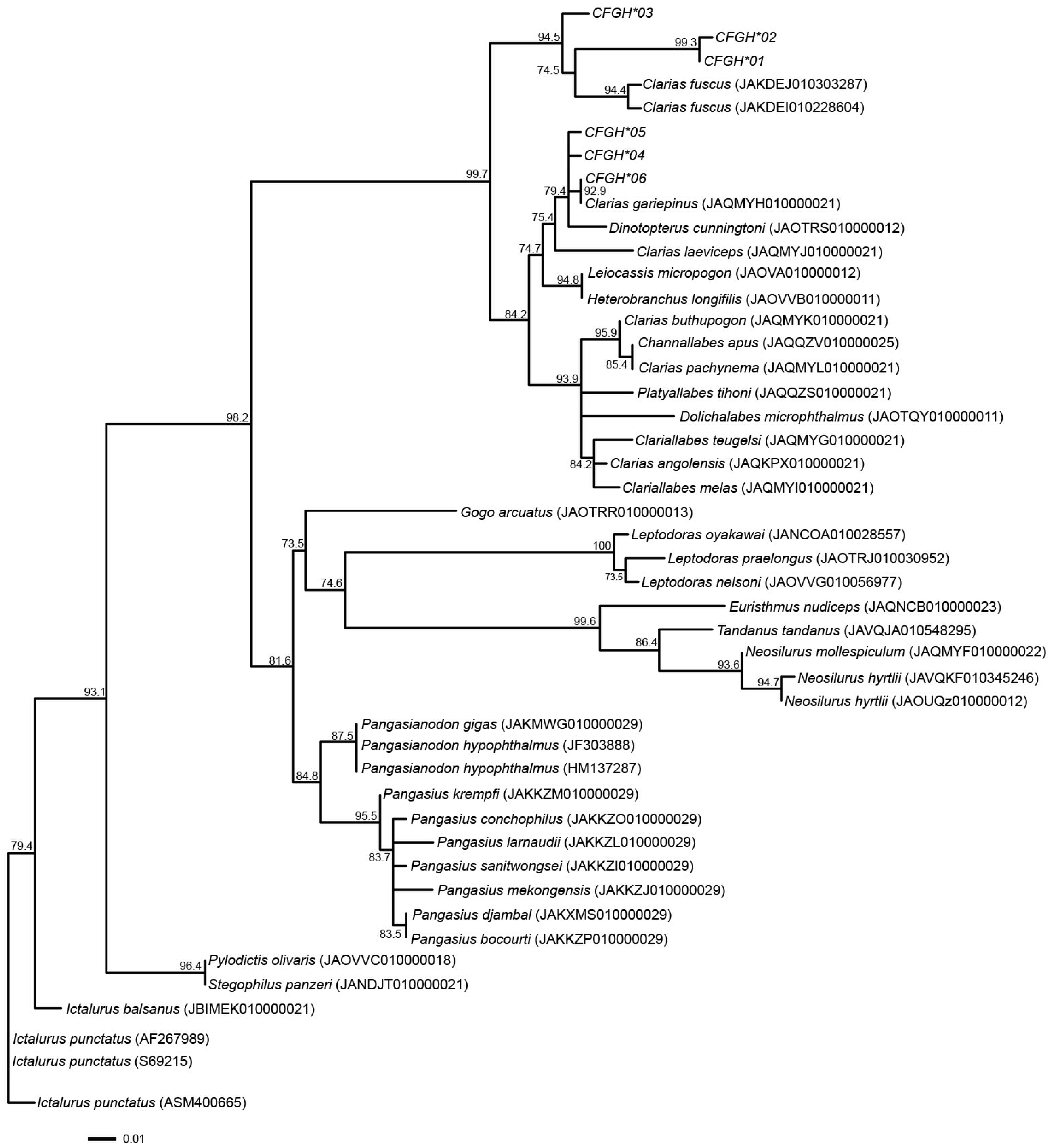 - Kappas, I.; Vittas, S.; Pantzartzi, C.N.; Drosopoulou, E.; Scouras, Z.G. A time-calibrated mitogenome phylogeny of catfish (Teleostei: Siluriformes). PLoS ONE 2016, 11, e0166988. [Google Scholar] [CrossRef] [PubMed]