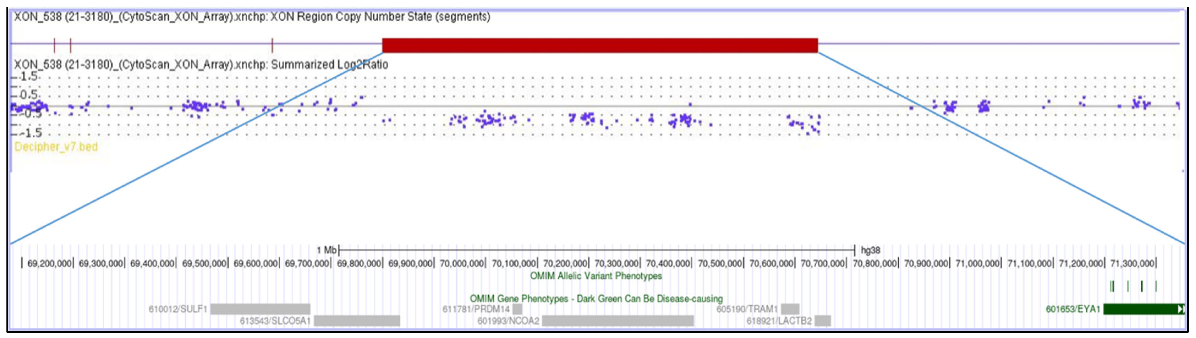 A 22-year-old female, born at term, second child of healthy non-consanguineous parents, presented with severe congenital bilateral mixed hearing loss, bilateral preauricular fistulas, hypoplasia of the left shoulder muscles, winged scapula, short stature (<3rd percentile), and a history of speech delay. Chromosome analysis revealed a normal female karyotype (46,XX). Analysis of the EYA1 gene was negative for variants using sequencing approaches. MLPA analysis identified a heterozygous de novo deletion encompassing the entire coding region of EYA1 at 8q13.3. CMA (Figure 1) confirmed a 2.3 Mb interstitial deletion at 8q13.2q13.3 chromosomal region, which spanned from nucleotides 69,068,130 to 71,362,732 (GRCh38) and involved 12 genes (LINC01592, LINC01603, SULF1, SLCO5A1, PRDM14, NCOA2, LOC101926892, TRAM1, LACTB2-AS1, LACTB2, XKR9, EYA1), and which are further characterized in Table 2. The microdeletion occurred de novo because both parents were wild-type.