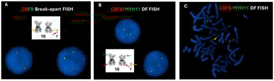 - Yang, R.K.; Toruner, G.A.; Wang, W.; Fang, H.; Issa, G.C.; Wang, L.; Quesada, A.E.; Thakral, B.; Patel, K.P.; Peng, G.; et al. CBFB Break-Apart FISH Testing: An Analysis of 1629 AML Cases with a Focus on Atypical Findings and Their Implications in Clinical Diagnosis and Management. Cancers 2021, 13, 5354. [Google Scholar] [CrossRef] [PubMed]