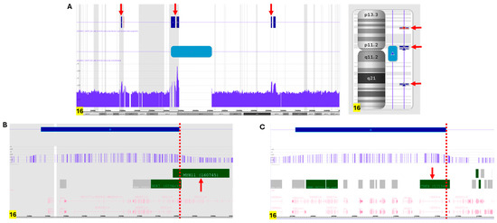 Concurrent SNP microarray (Affymetrix CytoScan HD from Themo-Fisher, Waltham, MA, USA) analysis revealed three duplicated segments of chromosome 16, including a 377 kb segment affecting 16p12.11 which partially encompasses 3′ MYH11 (GRCh37:15438165-15814747), a 363 kb segment involving 16q22.1 which partially encompasses 5′ CBFB (GRCh37: 66762847-67125895), and a large duplicated segment (14.25 Mb) likely spanning the centromere of chromosome 16 (GRCh37: 32511179-46534977) (Figure 2A). These findings suggest that the ring chromosome is composed of rearranged segments from chromosome arms 16p and 16q, resulting in the CBFB::MYH11 fusion. Based on the information of the coordinates by SNP microarray, a type A (CBFB::MYH11/E5–E33) transcript can be postulated using the UCSC Genome Browser v. GRCh37. The presence of an intact centromere may explain the faithful chromosome segregation and transmission of this ring chromosome 16 during cell division (Figure 2A) [21].