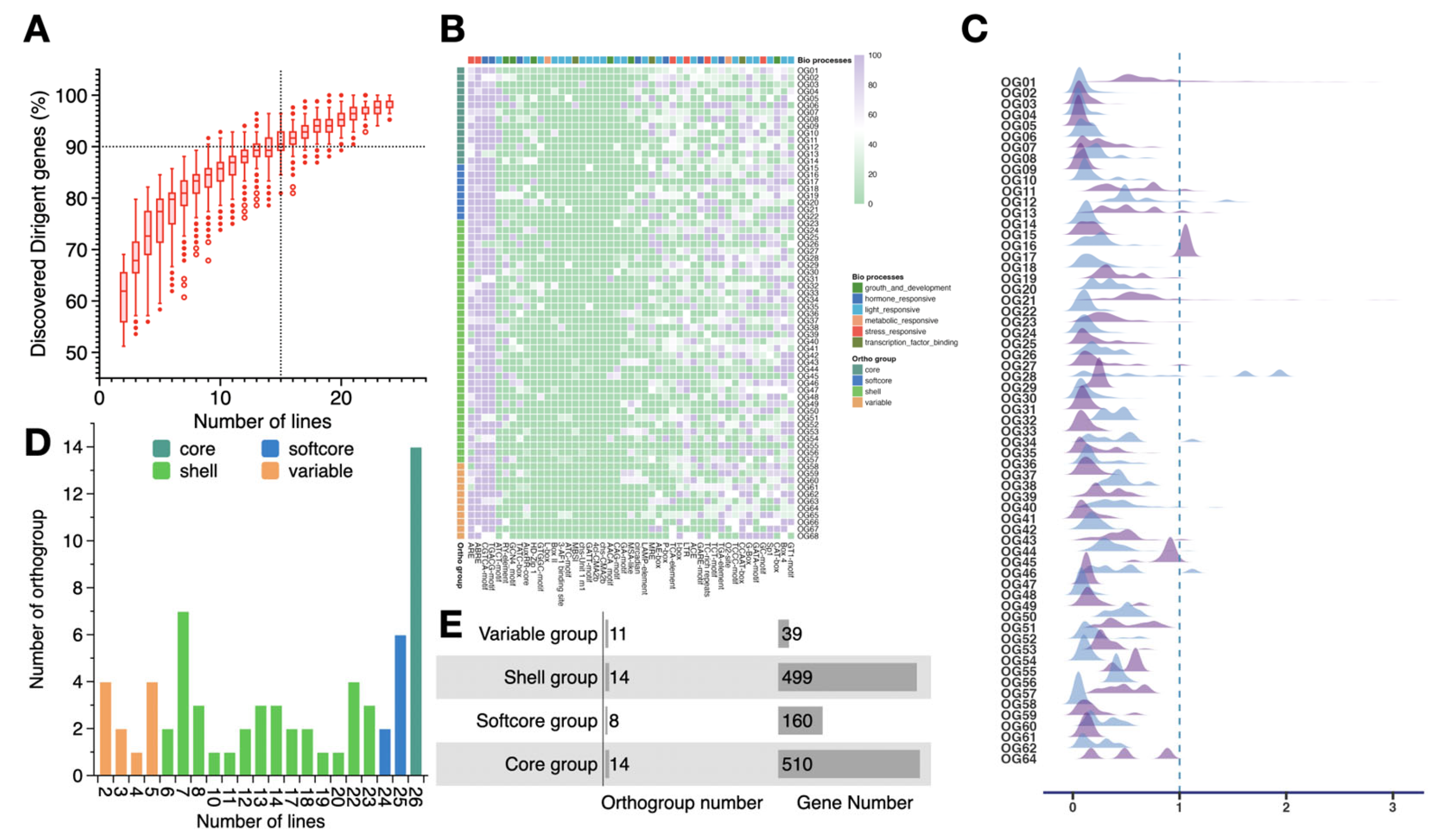 Figure 2. Statistics and properties analysis for the maize dirigent pan-gene family. (A) Saturation of dirigent gene family discovery. Boxes indicate fractions of the dirigent pan-gene family recoverable from randomly selected sets of lines of different sizes (1000 bootstrap replications). The vertical dashed line and horizontal dashed line indicate that 90% of dirigent genes can be recovered from 15 inbred lines. (B) Distribution of cis-acting regulatory elements in different orthogroups (OGs). The color blocks above the heatmap indicate the categories of cis-acting elements; the color blocks to the left of the heatmap indicate the pan-genome categories of each OG. (C) Ka/Ks ratios of different OGs. (D) OG size distribution. The bar color indicates different OGs: core, softcore, shell, and variable. (E) Genomic composition: number of OGs and genes in the dirigent pan-gene family categories.