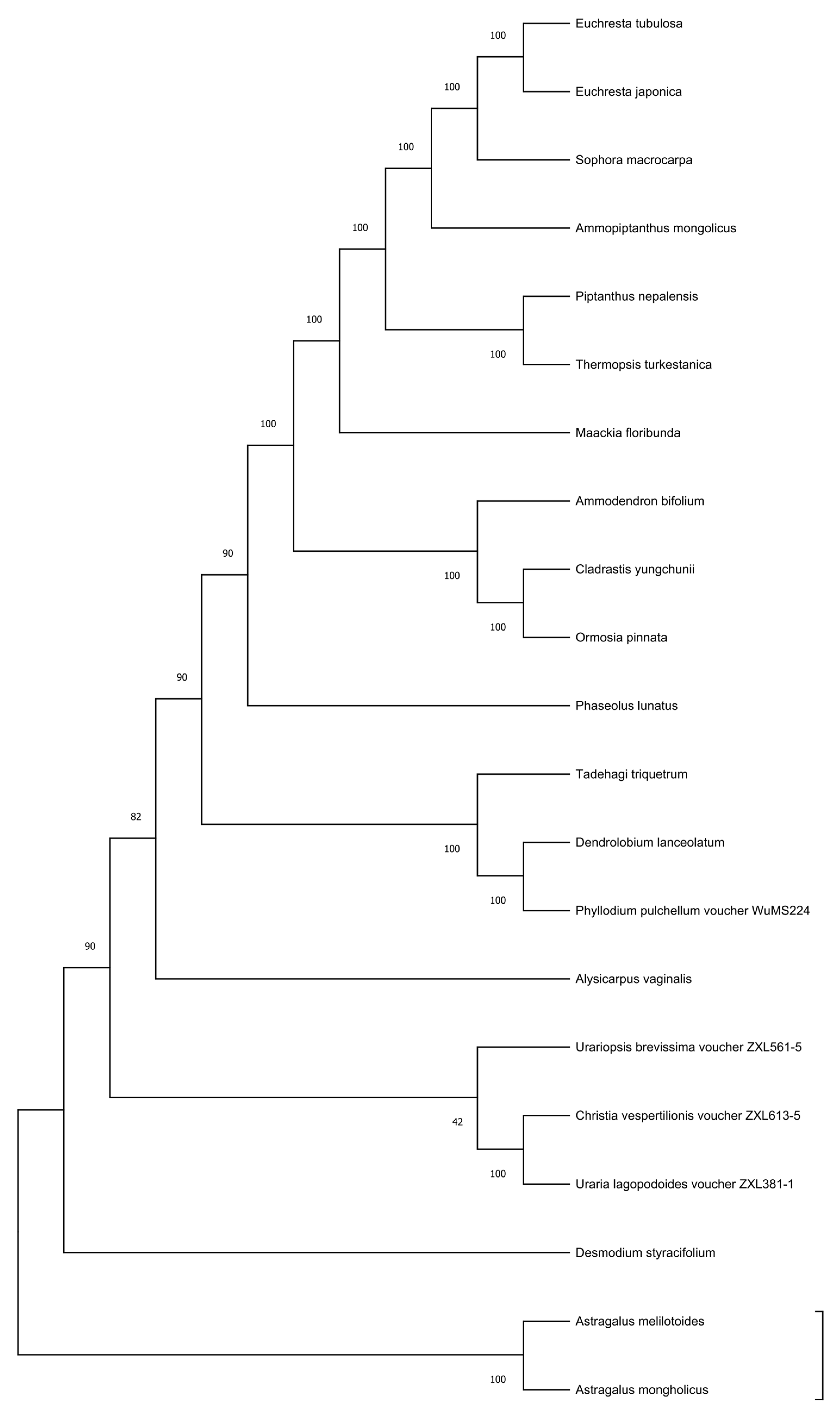 Chloroplast genome sequences of 19 species from the subfamily Papilionoideae (Fabaceae) and 2 outgroup species (Astragalus melilotoides and Astragalus mongholicus) were downloaded from the NCBI database. Multiple sequence alignment of the chloroplast genome sequences was performed using MAFFT software [43] within the Phylosuite platform. The alignment results were trimmed using trimAl software [44].