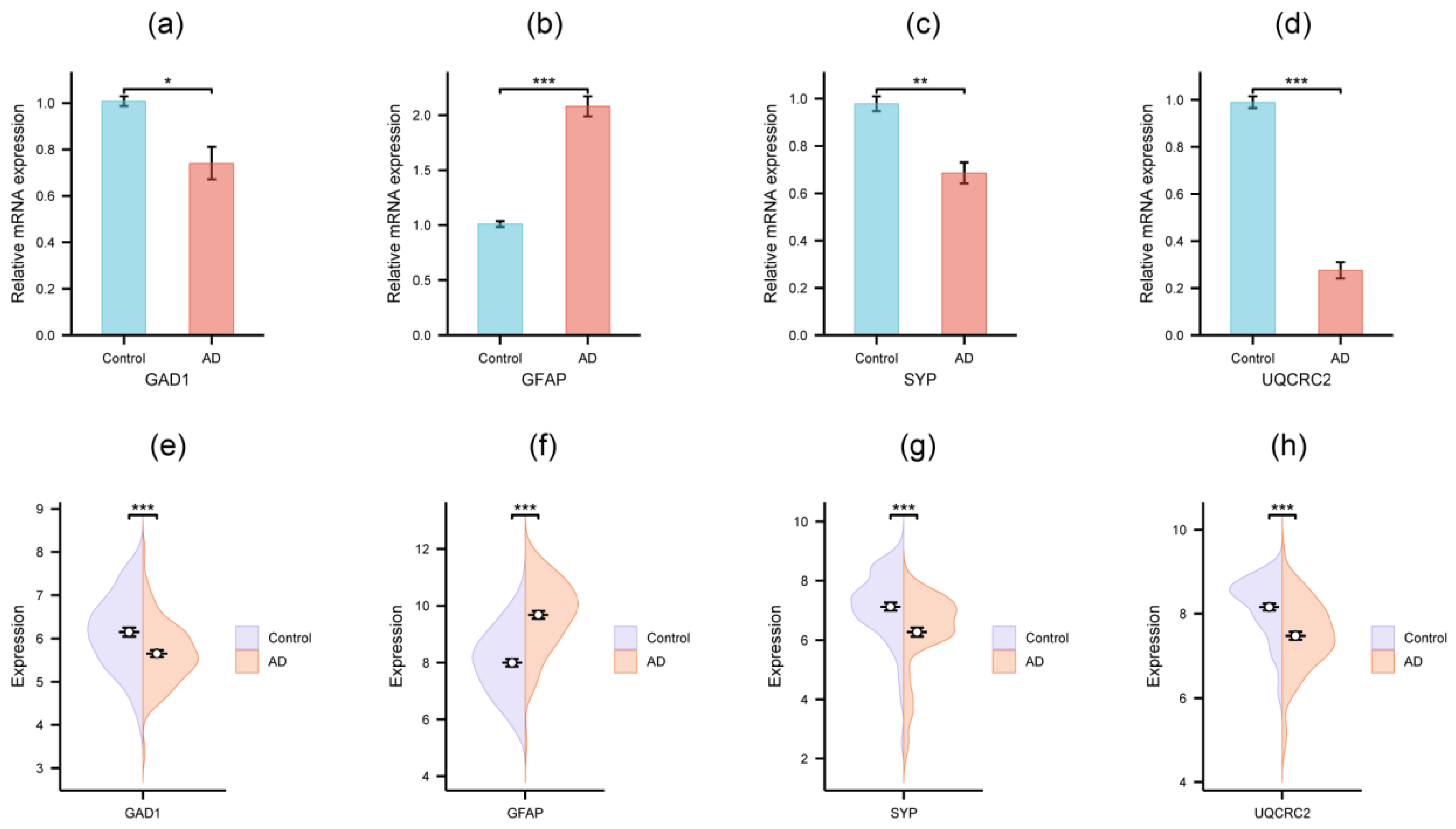 - Zhang, Y.; Kiryu, H. Identification of oxidative stress-related genes differentially expressed in Alzheimer’s disease and construction of a hub gene-based diagnostic model. Sci. Rep. 2023, 13, 6817. [Google Scholar] [CrossRef]