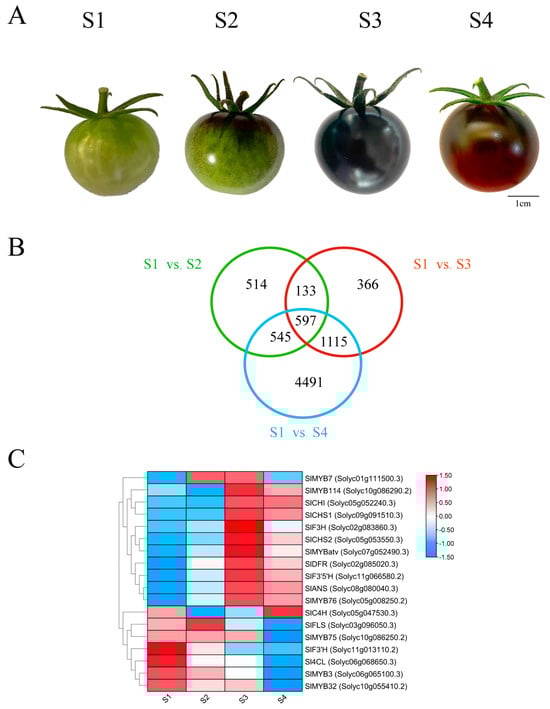 Transcriptomic analysis of fruit coloration in the ‘Black pearl’ tomato. (A) Fruit phenotypes at four developmental stages: S1 (mature green), S2 (coloring), S3 (purple immature), and S4 (fully ripened). Scale bar = 0.5 cm; (B) Venn diagram of differentially expressed genes (DEGs) across stages. (C) Expression patterns of key anthocyanin biosynthesis genes.
