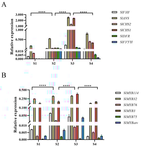 The expression dynamics of key structural genes were consistent between qRT-PCR and RNA-seq analyses. Their transcript levels increased gradually during fruit development, peaked at the S3 stage, and then slightly decreased at S4 (Figure 2A). The expression of SlMYB114, SlMYB75 and SlMYB76 peaked at the S2 stage and thereafter gradually decreased, reaching its lowest level at the S4 stage. Conversely, the transcript levels of SlMYB3, SlMYB32 and SlMYBatv increased during the early stages of fruit development, attained their maximum at S3 stage, and then declined (Figure 2B).