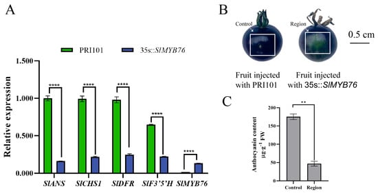 SlMYB76 overexpression represses anthocyanin production. (A) Expression analysis of SlMYB76 and its target genes. Data are mean ± SD (n = 3); **** p < 0.0001 (two-way ANOVA, Sidak’s test). (B) Representative fruit peel phenotypes. “Control”: area infiltrated with empty vector (pRl101); “Region”: area infiltrated with pRl101-SlMYB76. Scale bar = 0.5 cm. (C) Anthocyanin content in control and overexpression regions. Data are mean ± SD (n = 3); ** p < 0.01 (Student’s t-test).