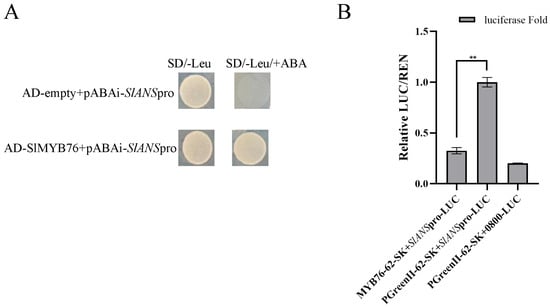 SlMYB76 directly represses SlANS transcription. (A) Yeast one-hybrid assay showing SlMYB76 binding to the SlANS promoter; (B) dual-luciferase assay confirming SlMYB76−mediated repression of SlANS promoter activity. Data are mean ± SD (n = 3); ** p < 0.01 (Student’s t-test).