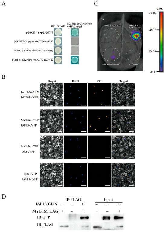SlMYB76 interacts with SlJAF13. (A) Protein–protein interaction analyzed by yeast two-hybrid assay on selective media. (B) Bimolecular fluorescence complementation (BiFC) showing nuclear localization of the complex in tobacco epidermal cells. Scale bar = 25 μm. (C) In vivo interaction detected by split-luciferase complementation imaging (LCI). (D) Physical association confirmed by co-immunoprecipitation (Co-IP) using tobacco protein extracts.