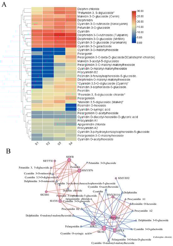 Selection of differentially metabolite related to fruit coloration in the ‘Black pearl’ tomato: (A) Differential metabolite clustering analysis; (B) network analysis of differential genes and differential metabolites.