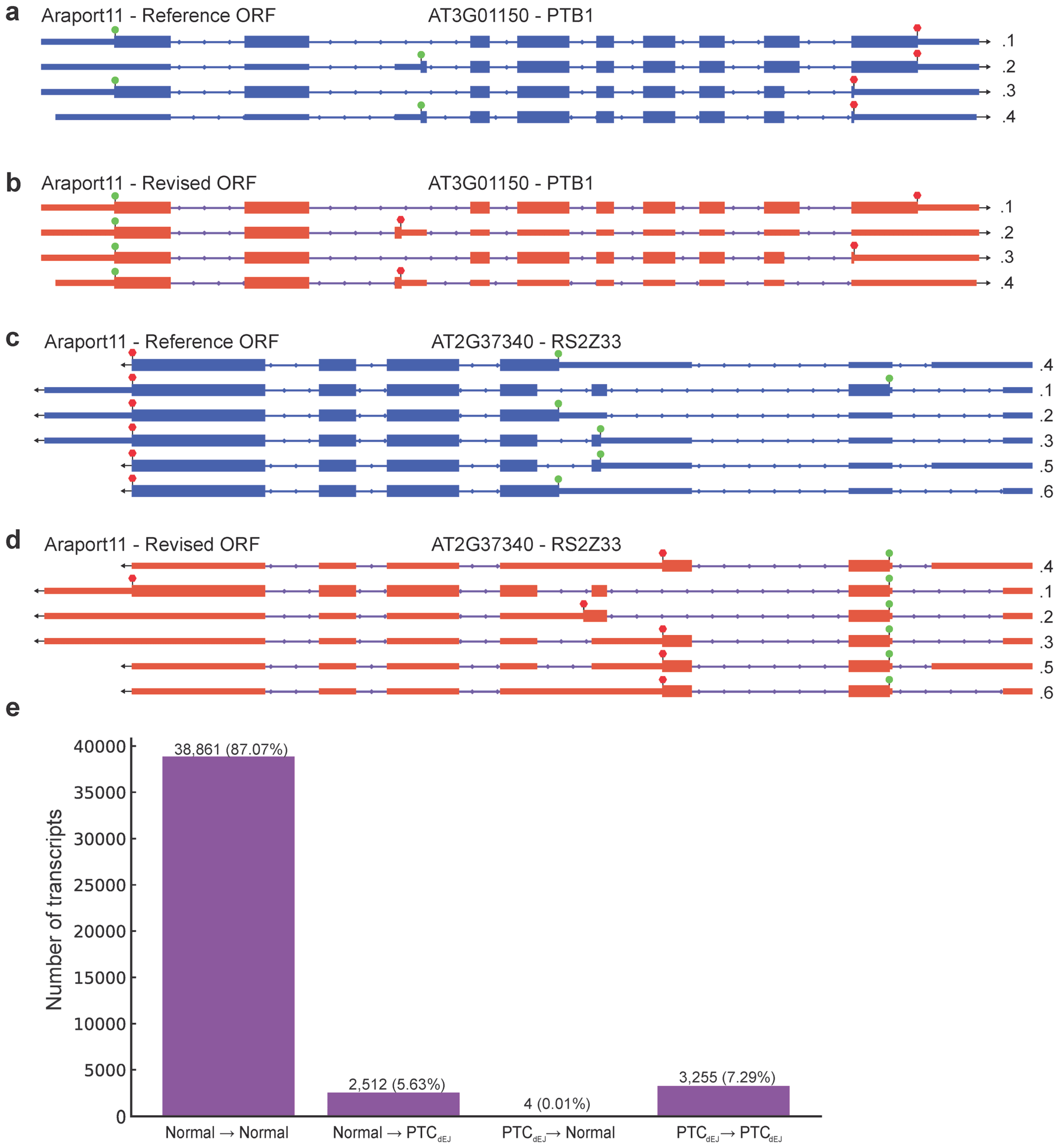 Figure 1c,d). Therefore, the Araport11 Revised ORFs generated by TranSuite for these known NMD targets allows for easy detection of the NMD triggering features in these transcripts, while the Araport11 Reference ORFs appear to have a normal 3′ UTR and would go undetected (