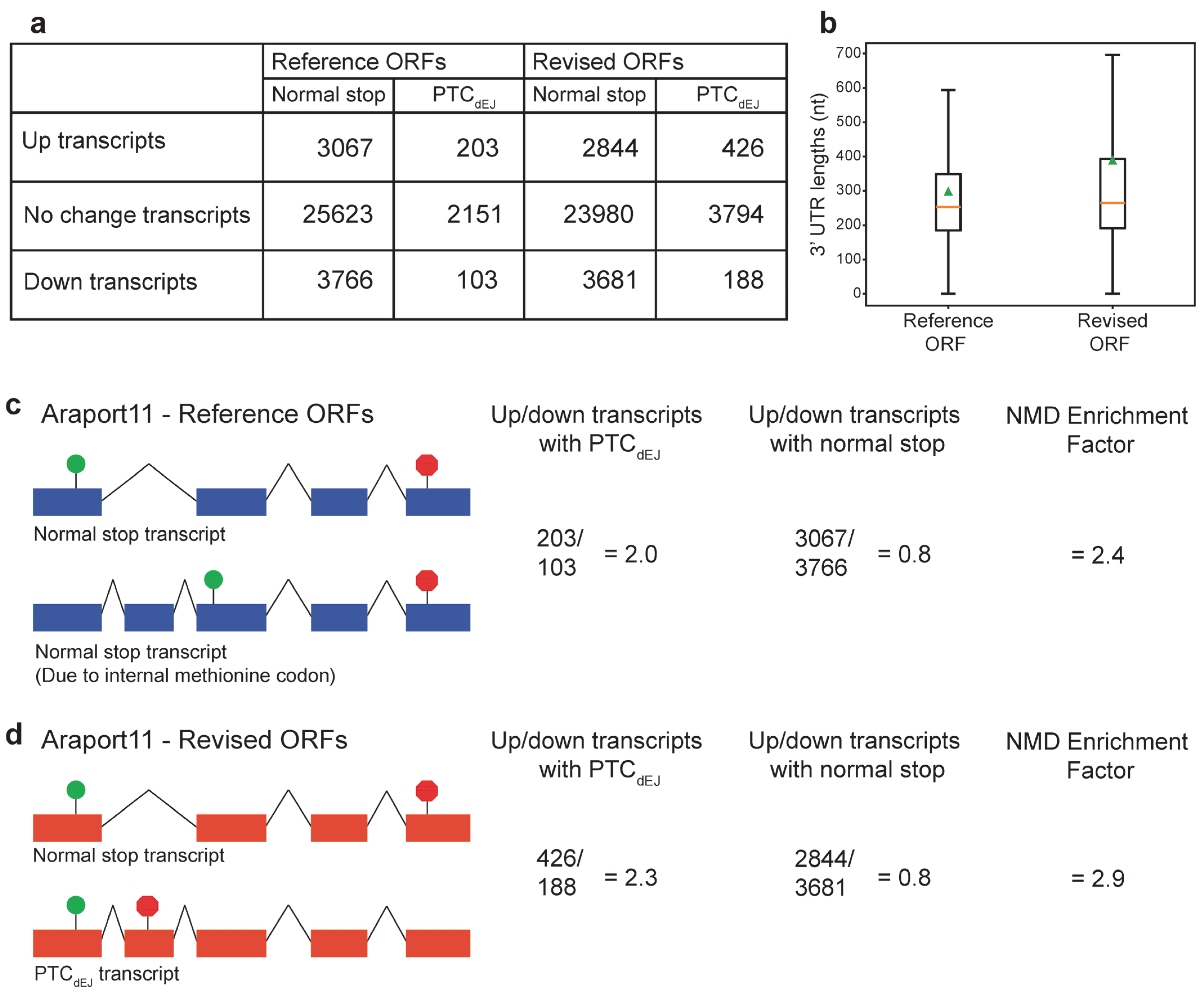 Figure 2b). This increase supports our notion that improving correct stop codon identification can help in identifying true NMD targets. In contrast, the ratio of up/down transcripts with normal stop codons remains largely unchanged (