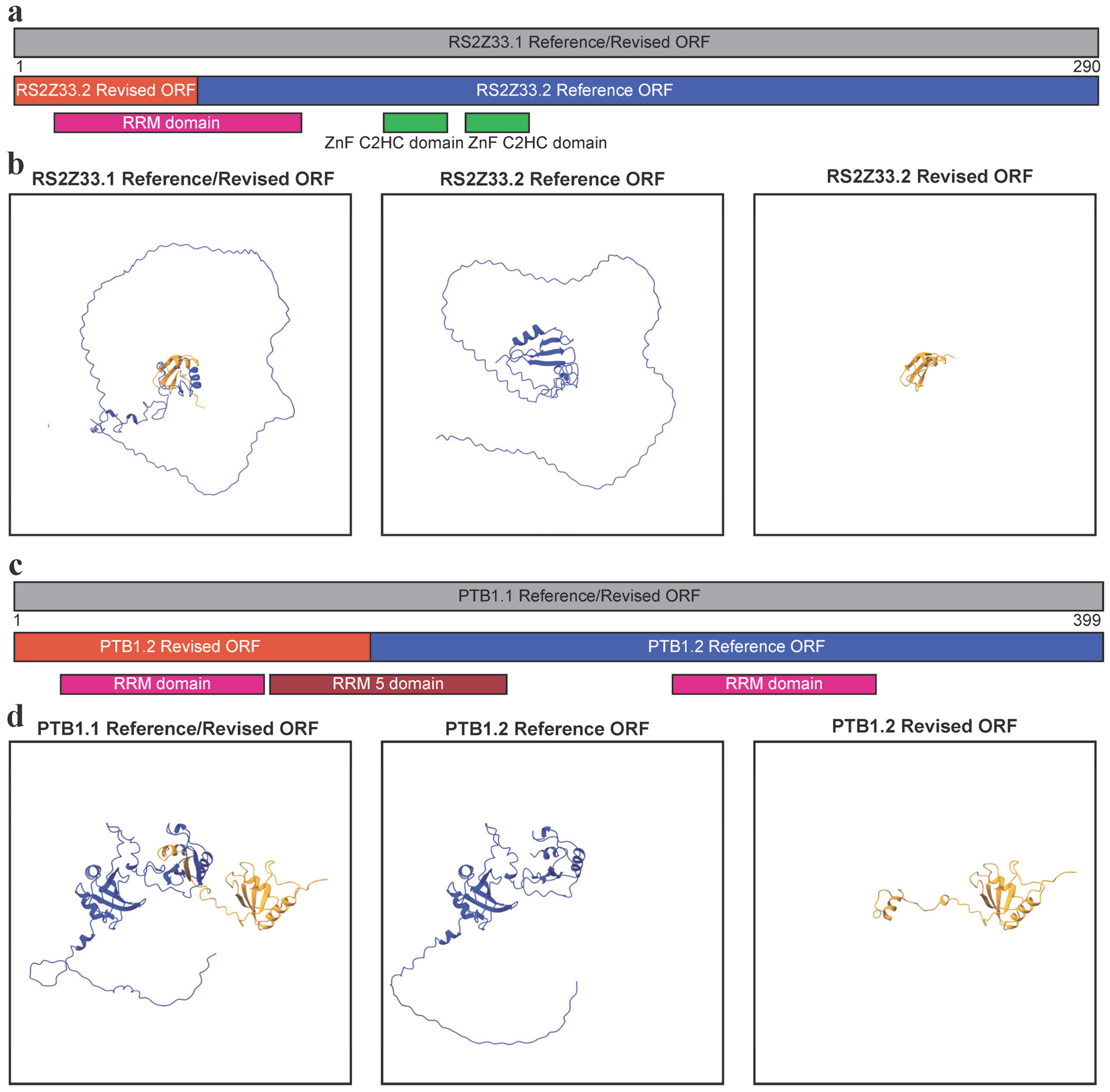 33]. The highest-ranked models (model_0.cif files) were downloaded and visualised using UCSF ChimeraX (v.1.9). Structures were rendered with the RS2Z33.2/PTB1.2 Reference ORF shown in blue and the RS2Z33.2/PTB1.2 Revised ORF shown in purple to highlight the dramatic structural differences between the longest ORF and the biologically correct ORF predictions. Protein domains were annotated by SMART (