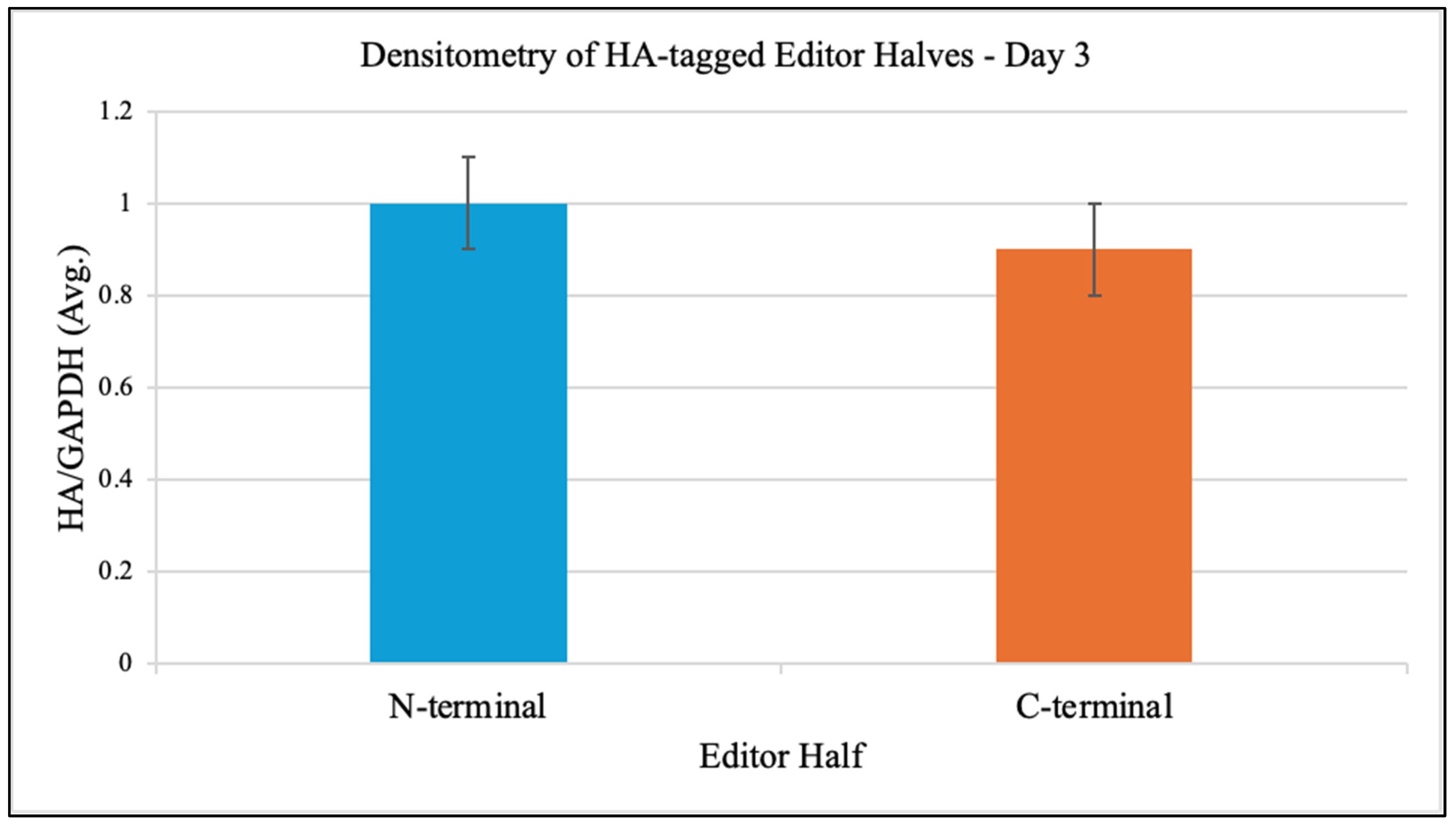 Western blot analysis at day 3 post-transfection confirmed robust expression of both editor halves in iPSCs. Densitometry of HA signal normalized to GAPDH yielded comparable levels for the N-terminal and C-terminal halves (