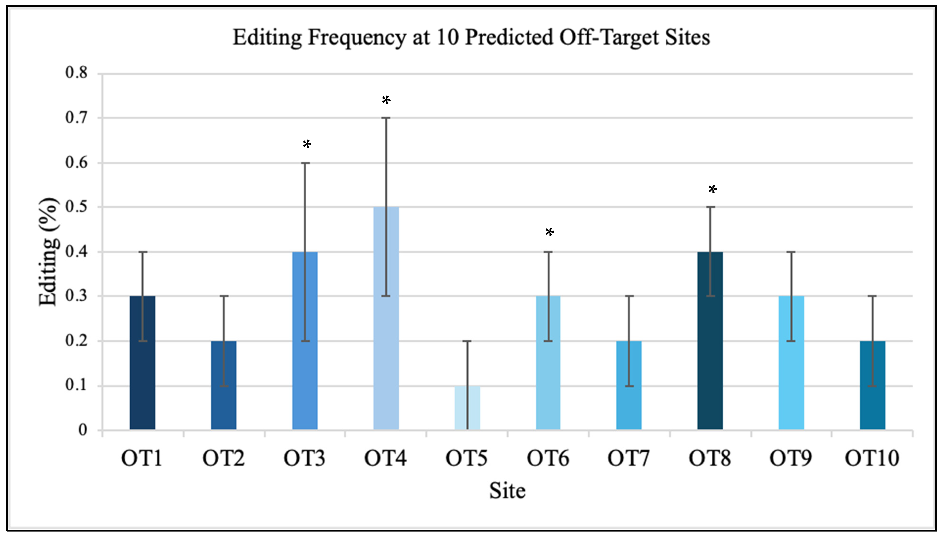 Sequencing of ten predicted off-target sites showed minimal editing, all below 0.5% (