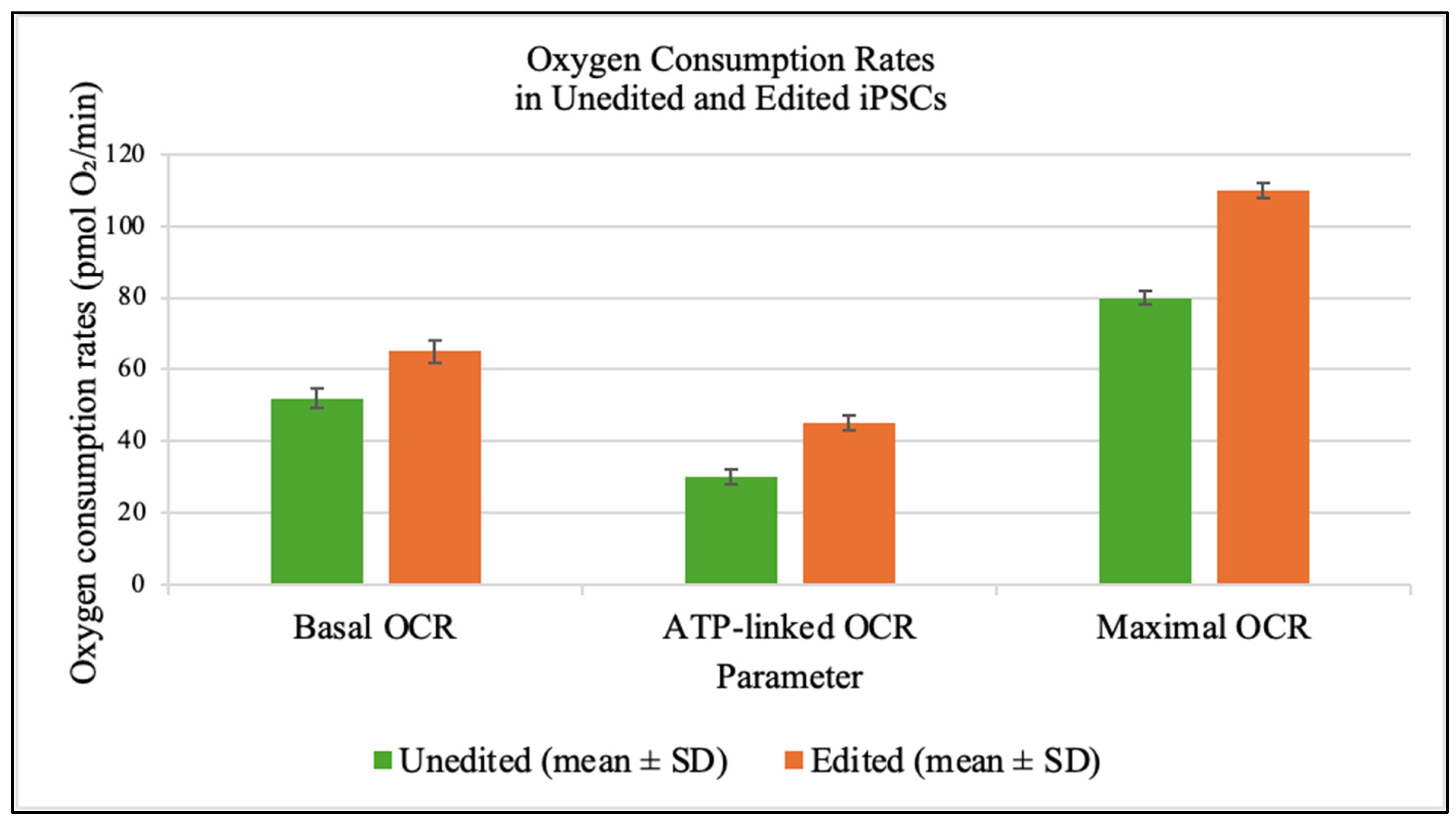 Isolated mitochondria from edited cells produced significantly more ATP (90 ± 2 nmol/min/mg) than those from unedited cells (40 ± 2 nmol/min/mg) (