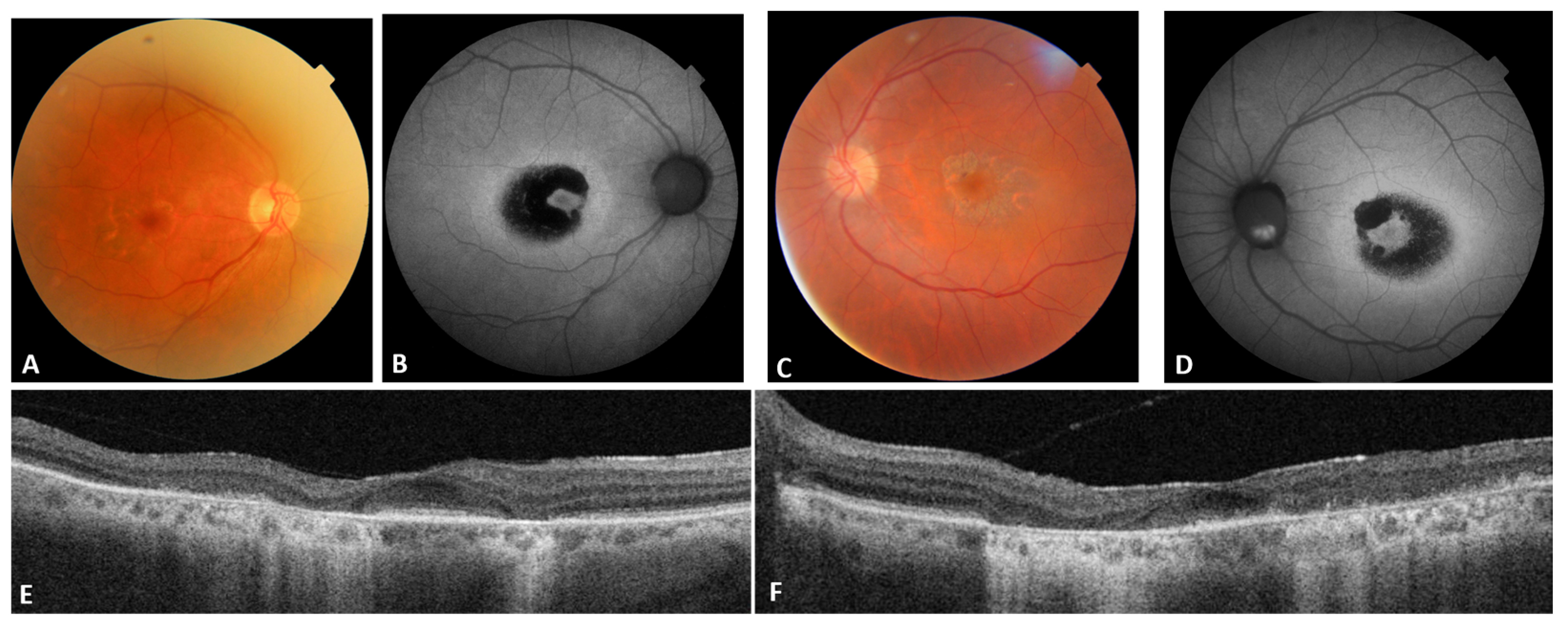 Patient #7 multimodal imaging. (A,C): OD and OS color fundus; (B,D): OD and OS blue autofluorescence; (E,F): OD and OS OCT.