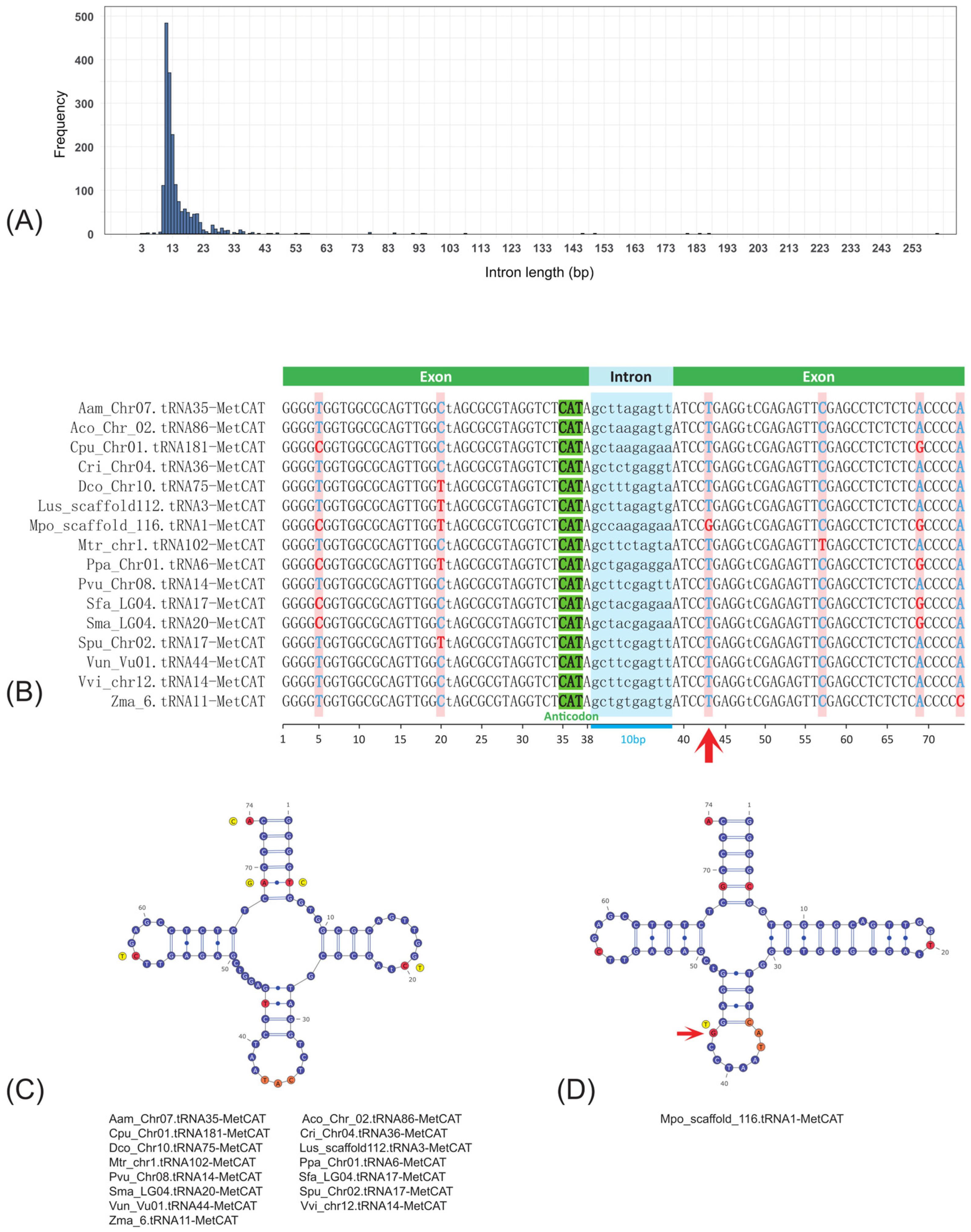 - Monloy, K.C.; Planta, J. tRNA gene content, structure, and organization in the flowering plant lineage. Front. Plant Sci. 2024, 15, 1486612. [Google Scholar] [CrossRef]