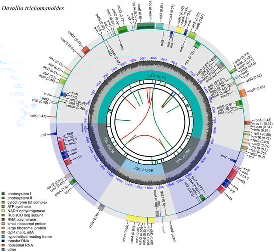 We generated 13.93 GB of Illumina 150-bp PE reads for plastome assembly. We trimmed adapters and low-quality bases with Trimmomatic v0.39 [15]. We assembled the plastome with GetOrganelle v1.5 [16] and retained the circular contig as the final plastome. We annotated genes with GeSeq v2.03 [17] and CPGAVAS2 v2.1.0 [18], identifying protein-coding genes (PCGs), rRNAs, tRNAs, IR boundaries, and genome orientation. We then checked and manually refined annotations in CPGView (http://www.1kmpg.cn/cpgview; accessed on 28 October 2025) [19], confirming exon–intron structure and cis-/trans-spliced genes. The finalized plastome of D. trichomanoides is deposited in GenBank (PX170254).