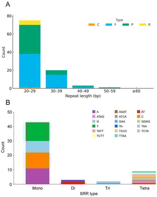 Repeats detected with REPuter showed a strongly right-skewed length distribution: most fell in the 20–29 bp bin, counts declined sharply with increasing length, and only sporadic cases were ≥ 50 bp. By type, palindromic and forward repeats dominated, reverse repeats were secondary, and complementary repeats were rare or absent (Figure 2A). The SSR set comprised mono-, di-, tri-, and tetranucleotide motifs; penta- and hexanucleotide SSRs were not detected. Mononucleotide SSRs were most abundant, followed by dinucleotides; trinucleotides and tetranucleotides were less common. Among mononucleotides, A/T motifs predominated; among dinucleotides, AT/TA prevailed; trinucleotides were enriched for AAT/ATT and AAG/CTT types (Figure 2B).