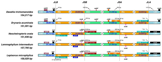 Comparison of the four junction sites (JLB, JSB, JSA, and JLA) between the inverted repeats (IRa, IRb) and single-copy regions (LSC and SSC) in five Polypodiaceae plastomes. Genes near the junctions are shown. Numbers indicate the distance in base pairs from the junction to the start or end of the adjacent gene.