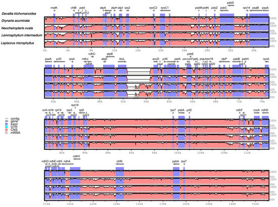 The mVISTA program (reference D. trichomanoides) shows high overall similarity among the five plastomes (Figure 5). Consistent with plastome organization, regions corresponding to the IRs appear more conserved than the LSC/SSC, and non-coding spacers vary more than coding sequences. Conserved peaks cluster around photosynthesis- and ribosome-related gene blocks (e.g., psb/psa/atp/rpl/rps), whereas most divergence is localized to intergenic spacers across the LSC and SSC.