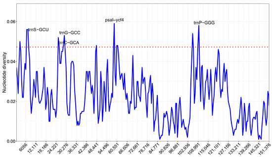 Using DnaSP sliding windows, nucleotide diversity across five plastomes shows low overall variability in the IRs and elevated peaks in the LSC/SSC (Figure 6). Pi values span ~0–0.059, with the highest signal immediately upstream of psal-ycf4 (58382–59402 bp; Pi = 0.059). Recurrent hypervariable segments (Pi ≥ 0.046) occur around trnS-GCU, trnC-GCA, and trnG-GCC block, the psal-ycf4 region, and within the SSC near the IRb boundary (e.g., 104.6–106.2 kb, 108.7–110.0 kb, the latter at trnP-GGG). In contrast, IR-embedded loci such as rrn23/rrn16 and psbA remain highly conserved (Pi ≈ 0–0.01).