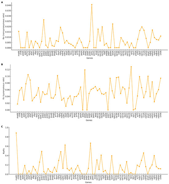Selective pressure on protein-coding genes across five plastomes. (A) Nonsynonymous substitution rate (Ka) for each gene. (B) Synonymous substitution rate (Ks) for each gene. (C) Ratio of nonsynonymous to synonymous substitutions (Ka/Ks or ω). Each point represents a single gene. Genes with Ks = 0 were treated as NA; genes with saturated Ks (e.g., >2) were not interpreted.
