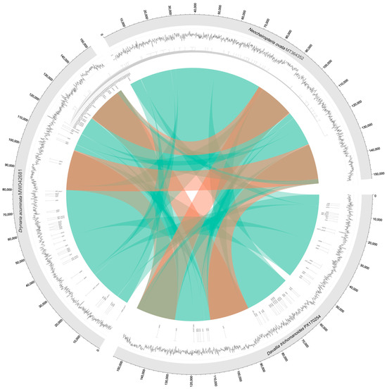 Circos plot visualizing synteny and alignment between three plastomes. The rings from outer to inner show: gene positions (outer ring), GC content (inner ring, black peaks), and aligned sequences between genomes (central ribbons). Ribbons are colored cyan for forward alignments and red for reverse alignments. Alignments were filtered for ≥80% identity and ≥500 bp length.
