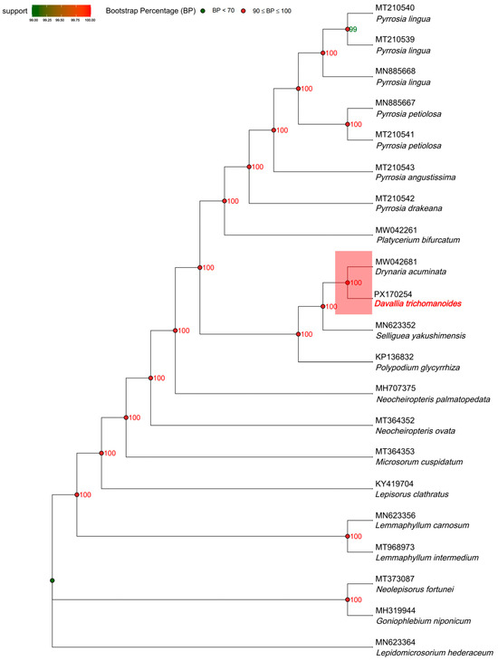 The plastome maximum-likelihood tree places D. trichomanoides as sister to D. acuminata with strong support, matching recent plastid phylogenomic studies in Polypodiaceae that stabilize epiphytic lineages [7]. The small boundary differences noted above do not disrupt the plastome-scale signal at this depth. The plastome is a single, largely non-recombining and typically uniparentally inherited locus. Consequently, it records the maternal history and can be affected by processes like introgression or incomplete lineage sorting. We therefore interpret this topology as representing the plastid history of the group. Future work will add nuclear target-capture data to test plastid–nuclear concordance and refine relationships.