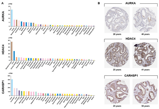 AURKA, HDAC4 and CARHSP1 were identified in our previous whole genome sequencing study as differentially methylated and differentially expressed genes in high-quality (score 6) vs. low-quality (score 0) spermatozoa [19], suggesting a potential involvement in male fertility (GO analysis). Integrative transcriptomic and proteomic analyses consistently predicted that these three genes are strong candidate biomarkers of testis function. Transcriptome profiling using data from the GTEx database confirmed that their expression was enriched in testis compared with most other organs (Figure 1A). AURKA was strongly expressed in testis, and at moderate levels in hematopoietic and lymphoid tissues, consistent with a specialized role in meiotic progression. CARHSP1 displayed a striking testis-specific enrichment, underscoring its potential as a germ cell–specific regulator. HDAC4 also was expressed in testis, albeit at lower levels than in skeletal muscle. However, its expression in different tissues of the reproductive system suggested regulatory functions in germ cells and somatic cells. Immunohistochemistry data from the Human Protein Atlas confirmed their distinct localization within the seminiferous tubules (Figure 1B).