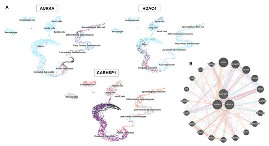 AURKA, HDAC4 and CARHSP1 gene expression in specific testis cell types and protein interactions. (A) UMAP plots showing the single-cell expression patterns of AURKA, HDAC4 and CARHSP1 in the testis. Each point represents a single cell and clustering reflects similarity in gene expression. The color intensity indicates the normalized expression levels (dark = high, light = low). AURKA is strongly expressed in proliferating cells, including spermatogonial stem cells and differentiating spermatogonia. HDAC4 shows diffuse expression in multiple cell types, including Sertoli and Leydig cells. CARHSP1 expression is restricted to late primary spermatocytes and differentiating spermatogonia, highlighting stage-specific roles during spermatogenesis. (B) Protein–protein interaction network of AURKA, HDAC4 and CARHSP1 generated using the GeneMANIA database.