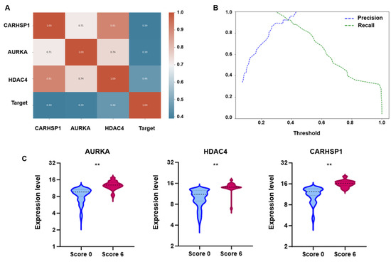 Correlation, classification performance, and differential expression analysis of candidate genes. (A) Pearson correlation heatmap. The heatmap displays the Pearson correlation coefficients between the three genes (AURKA, HDAC4, and CARHSP1) and the binary target variable (Target; high-resolution dynamic score). Coefficients range from −1 to 1; values close to 1 indicate strong positive correlation, values close to −1 indicate strong negative correlation, and values near 0 reflect no linear correlation. (B) Precision–recall analysis of the logistic regression model illustrates the effect of varying the decision threshold on the classification performance using the SFI. At very low thresholds, recall was close to 1, indicating that nearly all true positives were detected, but precision remained low due to a high number of false positives. Conversely, as the threshold approached 1, precision increased while recall decreased, reflecting a trade-off between the two metrics. An optimal balance was identified at 0.35–0.38, where both precision and recall were high, providing the best compromise for accurate classification. This threshold yielded improved performance in both training and test sets compared to the conventional 0.5 cut-off, confirming its relevance for robust sample discrimination. (C) Box plots showing the expression levels of AURKA, HDAC4 and CARHSP1 in sperm samples stratified in function of their high-resolution dynamic score (Score 0 vs. Score 6). For all three genes, expression was significantly higher in the Score 6 group than the Score 0 group (** = p < 0.01).