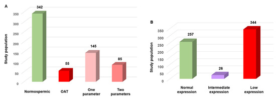 Comparison of semen quality using the WHO criteria and the SFI in 627 human sperm samples. (A) Sample distribution according to the WHO criteria: 54.5% normospermic, 23.1% with a single altered parameter, 13.5% with two altered parameters, and 8.8% with oligo-astheno-teratospermia (OAT). (B). Sample distribution based on the SFI: 54.9% with low expression, 41% with normal expression (SFI > 320), and 4.1% with intermediate expression.