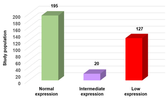 SFI variation in normal sperm samples according to the WHO criteria (n = 342). Samples were categorized based on their SFI value into three groups: normal expression (n = 195; 57%), intermediate expression (n = 20; 5.8%), and low expression (n = 127; 37%).