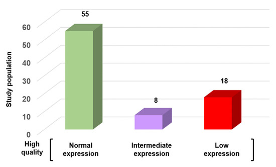 SFI variation in high-quality sperm samples according to the WHO criteria (n = 81). Samples were categorized based on their SFI value into three groups: normal expression (n = 55; 67.9%), intermediate expression (n = 8; 9.9%), and low expression (n = 18; 22.2%).