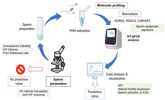 In the past decade, attempts to optimize sperm selection for ART have mainly focused on conventional semen parameters, such as concentration, motility, and morphology. Indeed, male infertility is routinely assessed through a visual examination of these parameters. These criteria provide information on sperm quality, but their normality does not indicate the complete absence of molecular alterations. Particularly, the transcriptomic and epigenetic landscapes of spermatozoa, which are critical for fertilization competence and early embryonic development, remain largely neglected in routine andrological assessments. This could be explained by the fact that for long time spermatozoa were considered just the passive transporters of the paternal genome. However, accumulating evidence highlights their active regulatory role in embryonic programming and reproductive success [5,25,26,27]. Moreover, several sperm proteins have emerged as potential biomarkers that could predict the outcome in ART, leading to the possibility of improved diagnosis.