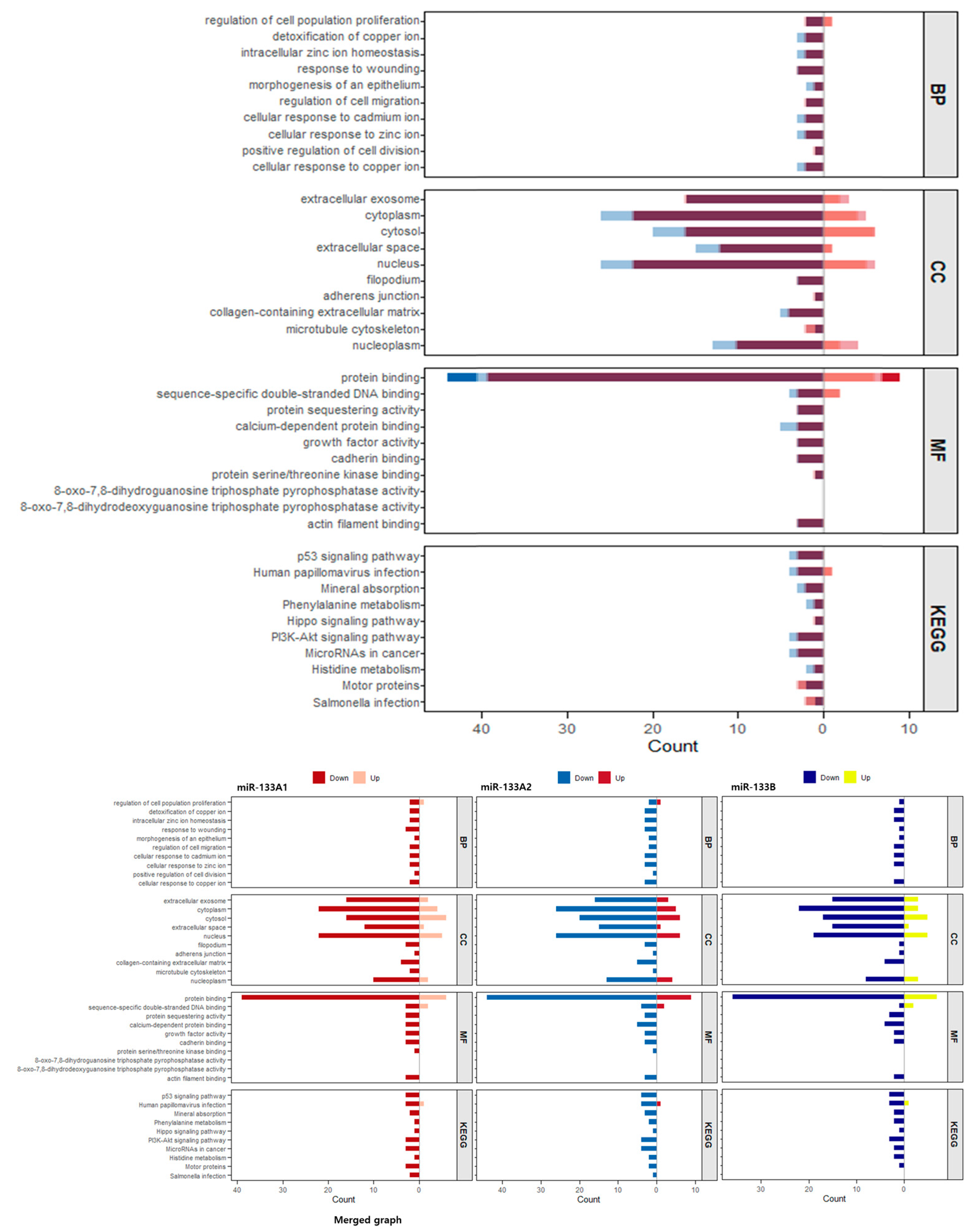 3.4. Functional Enrichment Analysis of Genes Regulated by miR-133 Isoforms