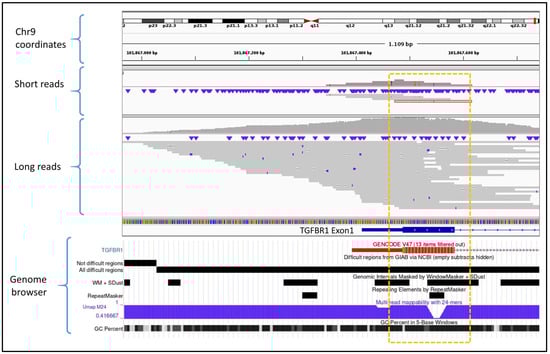 Comparative view of SRS (short reads) versus ONT LRS (long reads) alignments in a difficult-to-map and capture region located in exon 1 of the TGFBR1 gene. The short-read sample shows limited coverage in the target area (highlighted by the yellow rectangle), with very few reads aligned. In contrast, ONT LRS demonstrates improved coverage due to the increased mappability of long reads in low-complexity or repetitive regions. The genome browser panel at the bottom illustrates the genomic complexity of this region through multiple mapping difficulty scores. The genome track image was obtained from the UCSC Genome Browser (https://genome.ucsc.edu/).